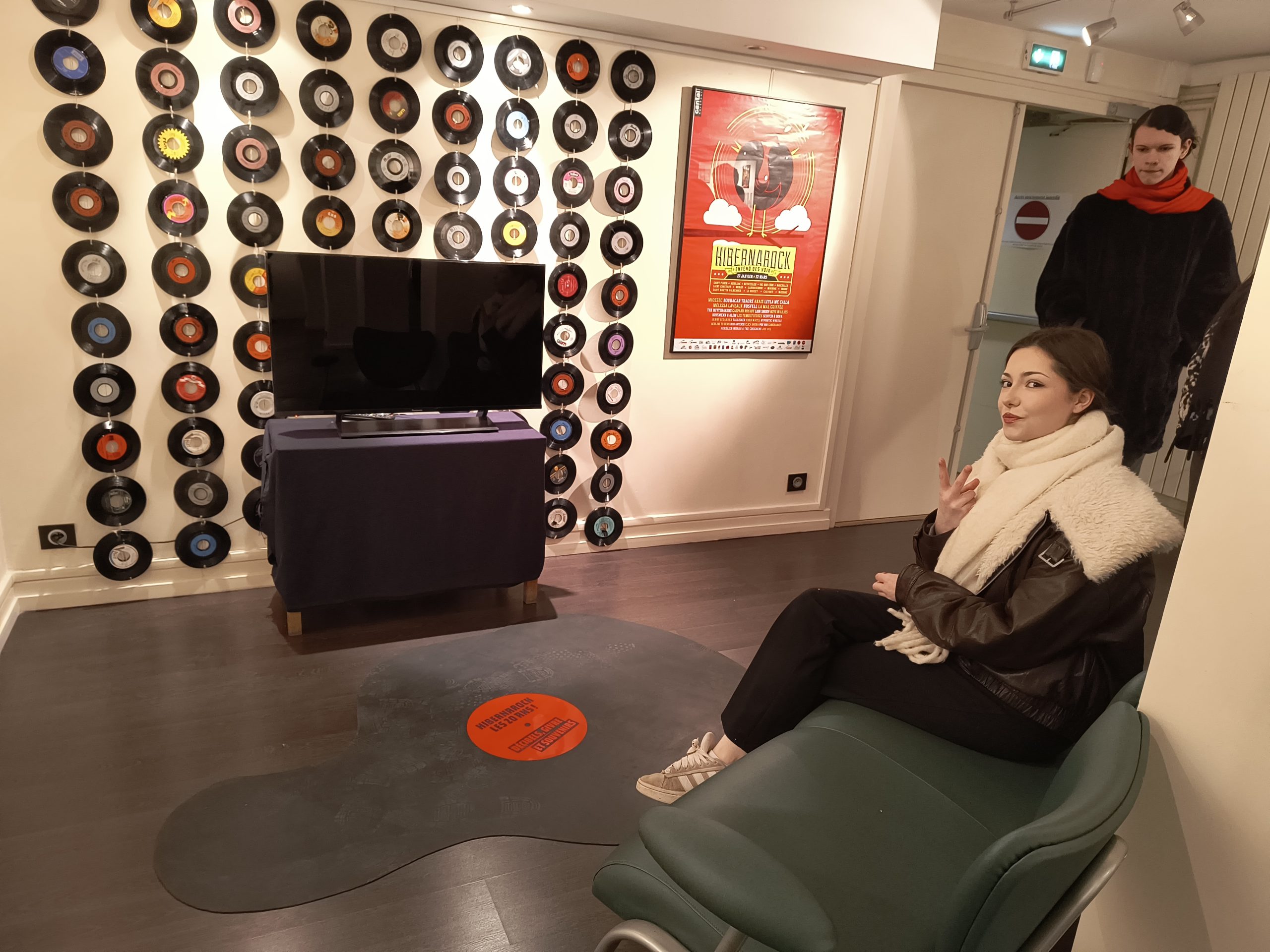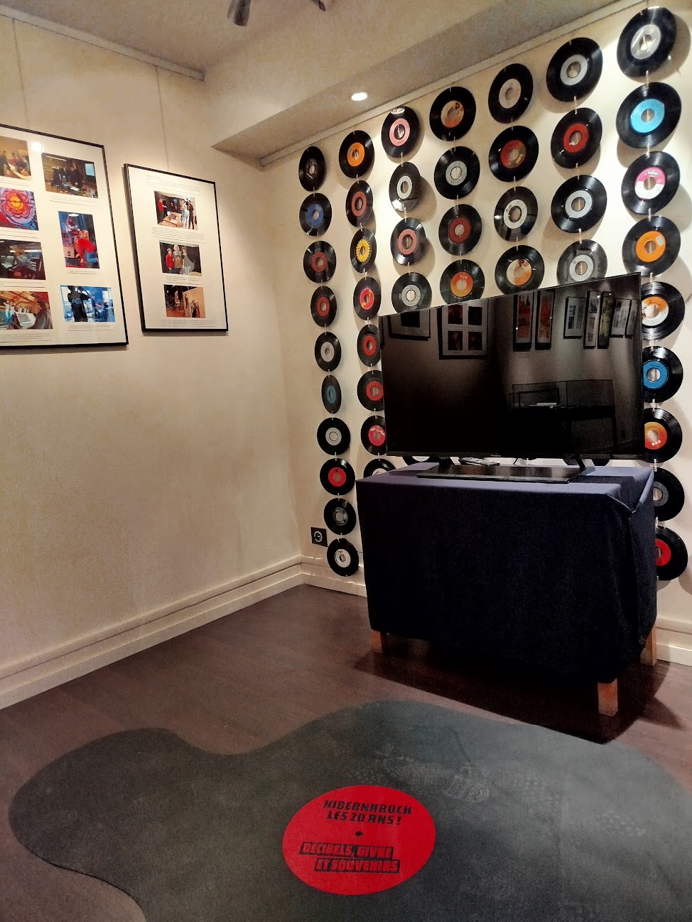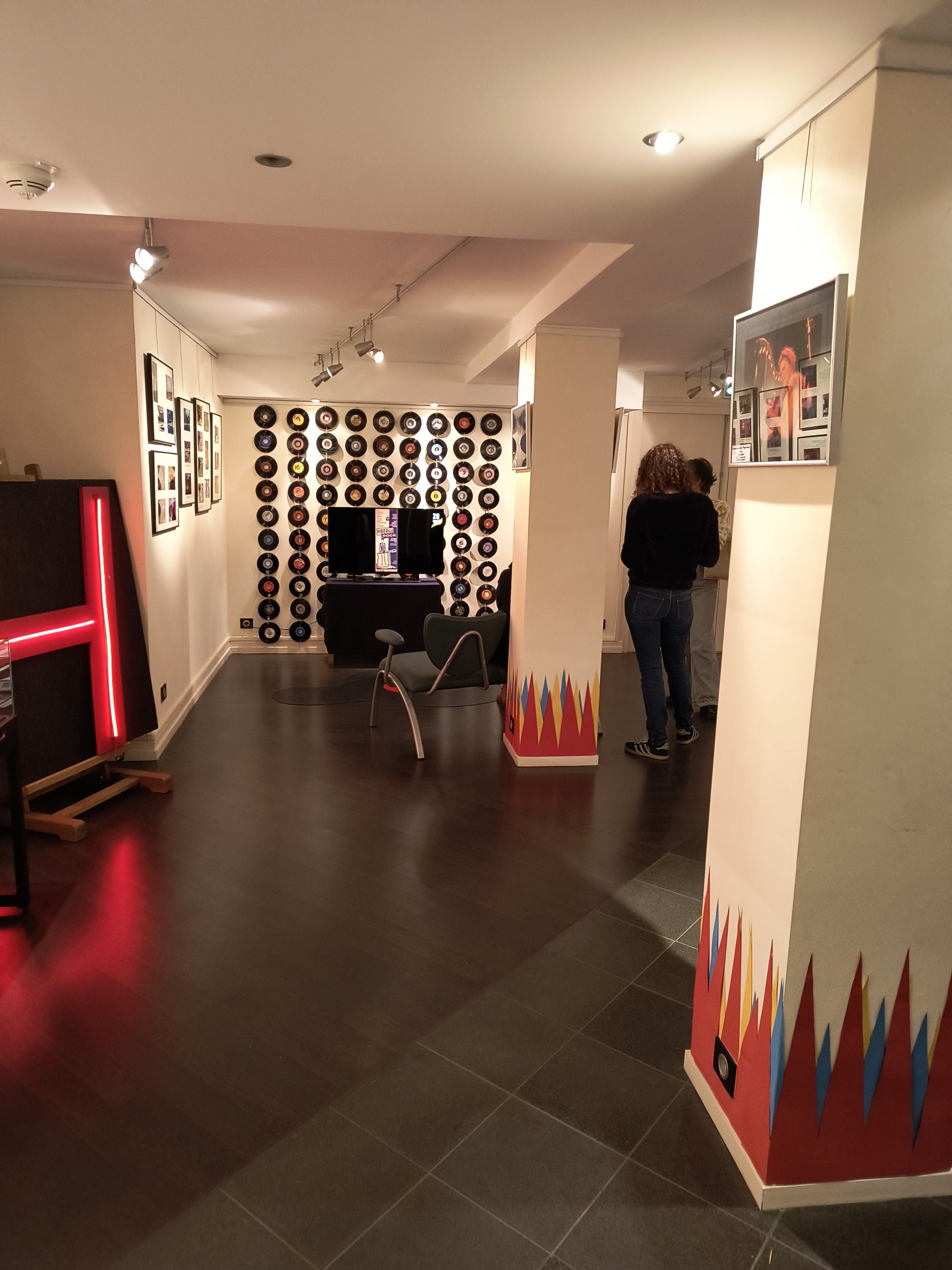 - un espace de projection convivial intégrant un tapis en forme de vinyle fondu et un rideau de disques.