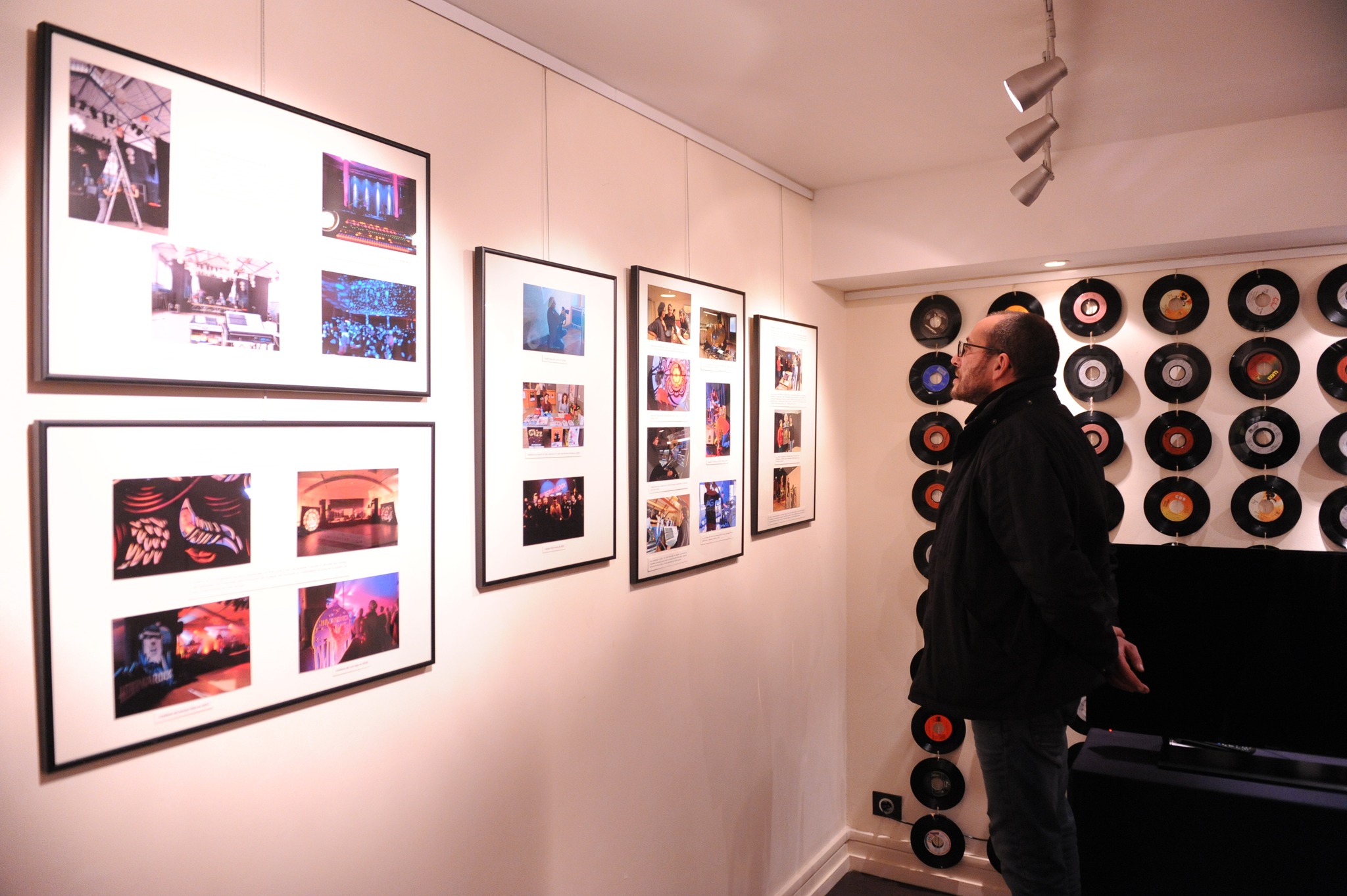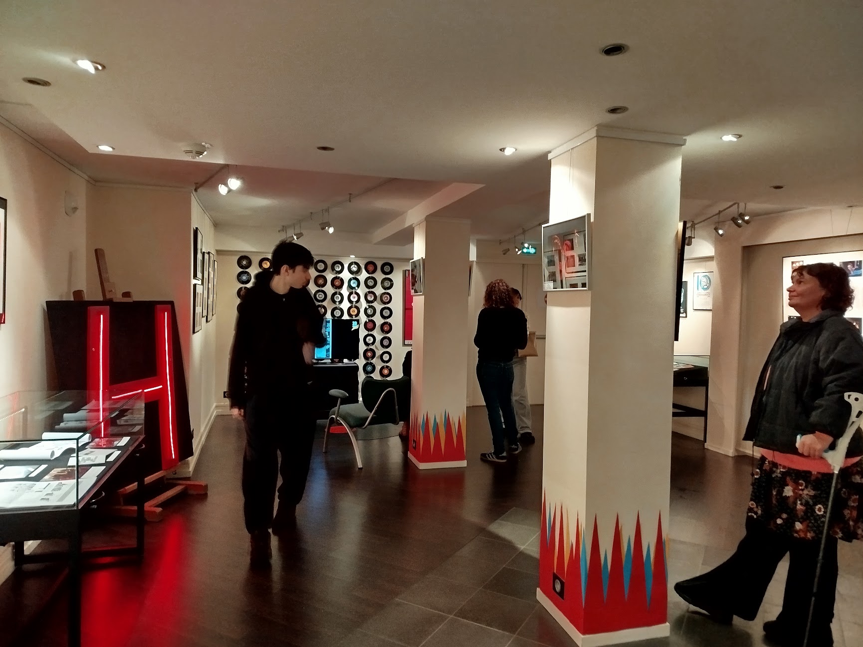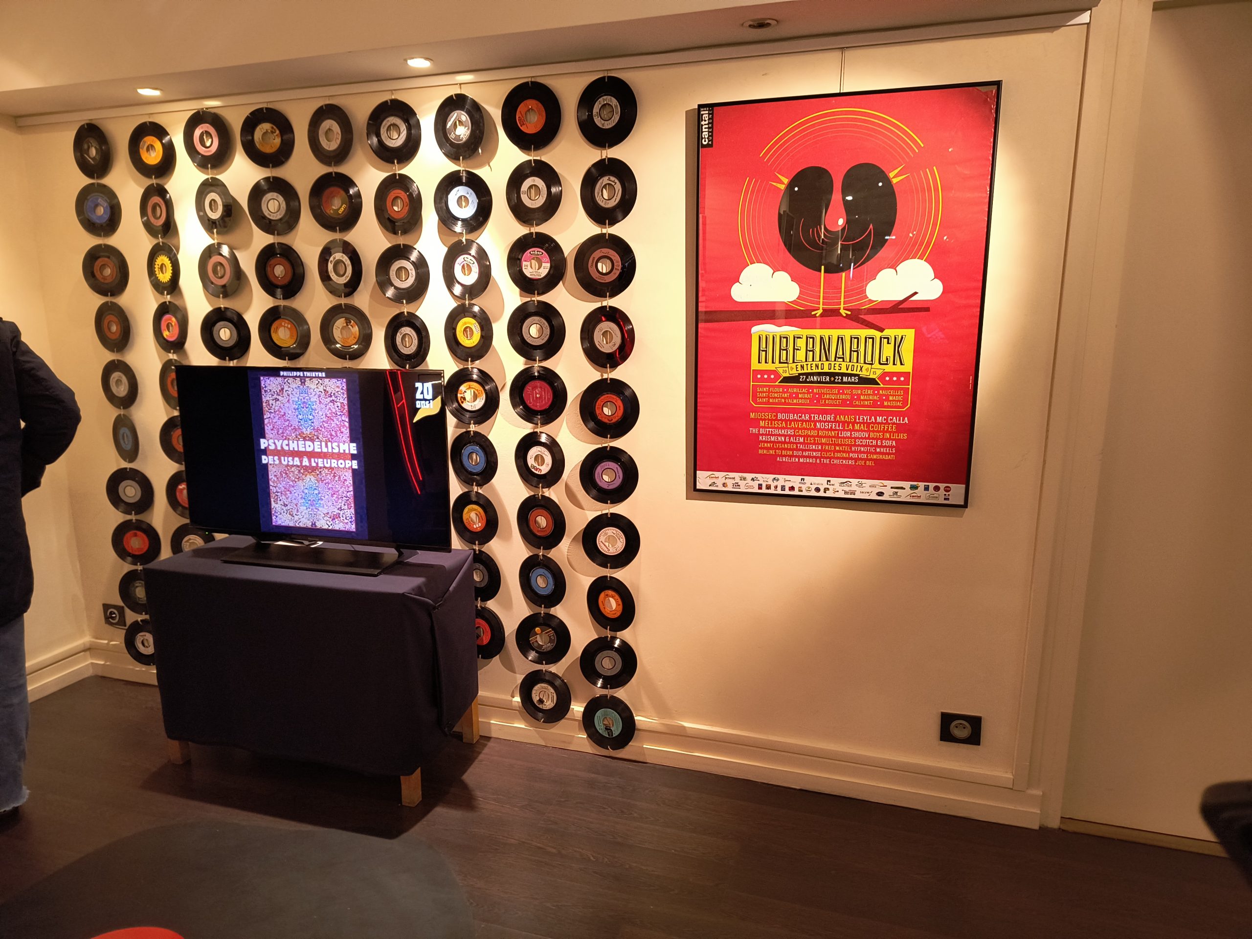 - un espace de projection convivial intégrant un tapis en forme de vinyle fondu et un rideau de disques.