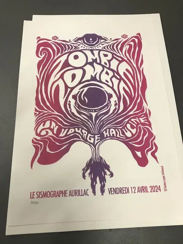 Nouveau concert au Sismographe ce vendredi 12 avril, nouvelle mission pour les six élèves de 1ère Pro CVPM accueillis en stage-interne au lycée, sous pavillon SG Factory : comment mettre en image le « Voyage Halluciné », titre du spectacle tant visuel que musical proposé par le groupe Zombie Zombie sur des images de Philippe Druillet, et accompagné du light-show expérimental réalisé en live par François Decourbe (un vieux de la vieille qui a travaillé jadis avec Gong, Frank Zappa et autres allumés notoires…) ?